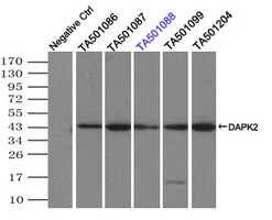 - Immunoprecipitation(IP) of DAPK2 by using monoclonal anti-DAPK2 antibodies (Negative control: IP without adding anti-DAPK2 antibody.). For each experiment, 500ul of DDK tagged DAPK2 overexpression lysates (at 1:5 dilution with HEK293T lysate), 2 ug of anti-DAPK2 antibody and 20ul (0.1 mg) of goat anti-mouse conjugated magnetic beads were mixed and incubated overnight. After extensive wash to remove any non-specific binding, the immuno-precipitated products were analyzed with rabbit anti-DDK polyclonal antibody.