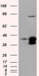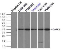- HEK293T cells were transfected with the pCMV6-ENTRY control (Left lane) or pCMV6-ENTRY DAPK2 (Right lane) cDNA for 48 hrs and lysed. Equivalent amounts of cell lysates (5 ug per lane) were separated by SDS-PAGE and immunoblotted with anti-DAPK2.