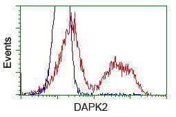 - Flow cytometric Analysis of Jurkat cells, using anti-DAPK2 antibody (GTX84631), (Red), compared to a nonspecific negative control antibody,(Blue).