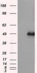 - HEK293T cells were transfected with the pCMV6-ENTRY control (Left lane) or pCMV6-ENTRY DAPK2 (Right lane) cDNA for 48 hrs and lysed. Equivalent amounts of cell lysates (5 ug per lane) were separated by SDS-PAGE and immunoblotted with anti-DAPK2.