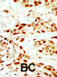 - Formalin-fixed and paraffin-embedded human cancer tissue reacted with DAPK2 polyclonal antibody (Cat # PAB2780) , which was peroxidase-conjugated to the secondary antibody, followed by DAB staining. This data demonstrates the use of this antibody for immunohistochemistry ; clinical relevance has not been evaluated. BC = breast carcinoma.