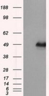 - Western Blot: DAP Kinase 2 Antibody (OTI1C5) [NBP2-02477] - HEK293T cells were transfected with the pCMV6-ENTRY control (Left lane) or pCMV6-ENTRY DAP Kinase 2 (Right lane) cDNA for 48 hrs and lysed. Equivalent amounts of cell lysates (5 ug per lane) were separated by SDS-PAGE and immunoblotted with anti-DAP Kinase 2.