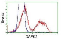 - Flow Cytometry: DAP Kinase 2 Antibody (OTI1C5) [NBP2-02477] - HEK293T cells transfected with either overexpression plasmid (Red) or empty vector control plasmid (Blue) were immunostained by anti-DAP Kinase 2 antibody, and then analyzed by flow cytometry.