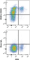 - Detection of DNAM-1/CD226 in Human PBMCs by Flow Cytometry. Human peripheral blood mononuclear cells (PBMCs) gated on CD3- cells were stained with Mouse Anti-Human NCAM-1/CD56 APC-conjugated Monoclonal Antibody (Catalog # FAB2408A) and either (A) Mouse Anti-Human DNAM-1/CD226 Monoclonal Antibody (Catalog # MAB666) or (B) Mouse IgG1 Isotype Control (Catalog # MAB002) followed by Phycoerythrin-conjugated Anti-Mouse IgG Secondary Antibody (Catalog # F0102B).