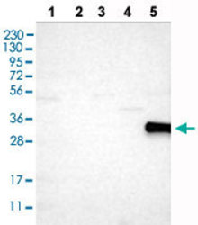- Western blot analysis of Lane 1: RT-4 cells, Lane 2: U-251MG sp cells, Lane 3: Human plasma (IgG/HSA depleted), Lane 4: Human liver tissue, Lane 5: Human tonsil tissue with CD226 polyclonal antibody (Cat # PAB29582).