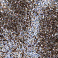 - Immunohistochemical staining (Formalin-fixed paraffin-embedded sections) of human tonsil shows strong cytoplasmic positivity in cells outside reaction centra with CD226 polyclonal antibody (Cat # PAB29582) at 1:50 - 1:200 dilution.