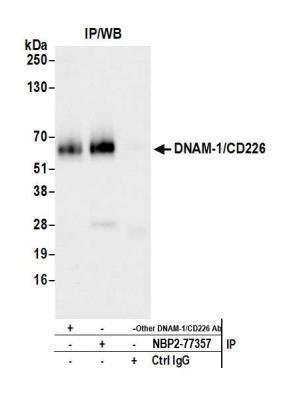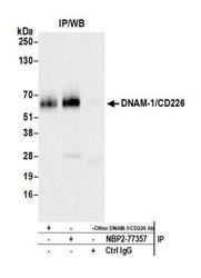 - Immunoprecipitation: DNAM-1/CD226 Antibody (BLR063G) [NBP2-77357] - Detection of human DNAM-1/CD226 by WB of immunoprecipitates from HH lysate. Antibodies: Rabbit anti-DNAM-1/CD226 recombinant monoclonal [BLR063G] (NBP2-77357) and another rabbit anti-DNAM-1/CD226 recombinant monoclonal [BL-799B-1B9].