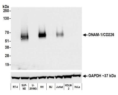- Western Blot: DNAM-1/CD226 Antibody (BLR063G) [NBP2-77357] - Antibody: Rabbit anti-DNAM-1/CD226 recombinant monoclonal [BLR063G] (NBP2-77357). Secondary: HRP-conjugated goat anti-rabbit IgG. Lower Panel: Rabbit anti-GAPDH.