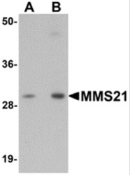 - Western blot analysis of MMS21 in 293 cell lysate with MMS21 antibody at (A) 0.5 and (B) 1 μg/ml.