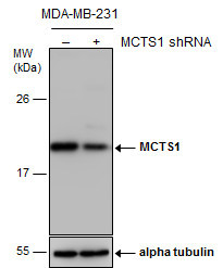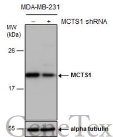 - Non-transfected (¡V) and transfected (+) MDA-MB-231 whole cell extracts (30 ?g) were separated by 12% SDS-PAGE, and the membrane was blotted with MCTS1 antibody [N1C3] (GTX117793) diluted at 1:500. The HRP-conjugated anti-rabbit IgG antibody (GTX213110-01) was used to detect the primary antibody.