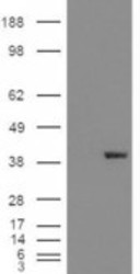 - HEK293 overexpressing AKR1A1 (RC200302) and probed with EB05538 (mock transfection in first lane), tested by Origene.