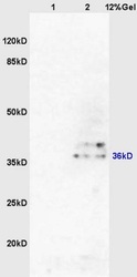 - Lane 1: mouse pancreas lysates Lane 2: mouse brain lysates probed with Anti AKR1A1 Polyclonal Antibody, Unconjugated (bs-1803R) at 1:200 in 4°C. Followed by conjugation to secondary antibody (bs-0295G-HRP) at 1:3000 90min in 37°C. Predicted band 36kD. Observed band size: 36kD.