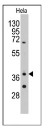 - Western blot analysis of anti-AKR1A1 Pab (Cat.#AP12361PU-N) in Jurkat cell line lysates (35ug/lane).AKR1A1 (arrow) was detected using the purified Pab (1:60 dilution).