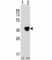 - Western blot analysis of AKR1A1 antibody and 293 cell lysate (2 ug/lane) either nontransfected (Lane 1) or transiently transfected (2) with the AKR1A1 gene.