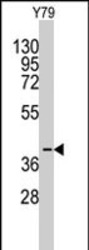 - Western blot analysis of AKR1A1 polyclonal antibody (Cat # PAB2580) in Y-79 cell line lysates (35 ug/lane). AKR1A1 (arrow) was detected using the purified polyclonal antibody.