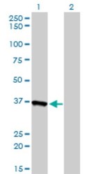 - Western Blot: AKR1A1 Antibody (1A11-2A4) [H00010327-M01] - Analysis of AKR1A1 expression in transfected 293T cell line by AKR1A1 monoclonal antibody (M01), clone 1A11-2A4.Lane 1: AKR1A1 transfected lysate(36.6 KDa).Lane 2: Non-transfected lysate.