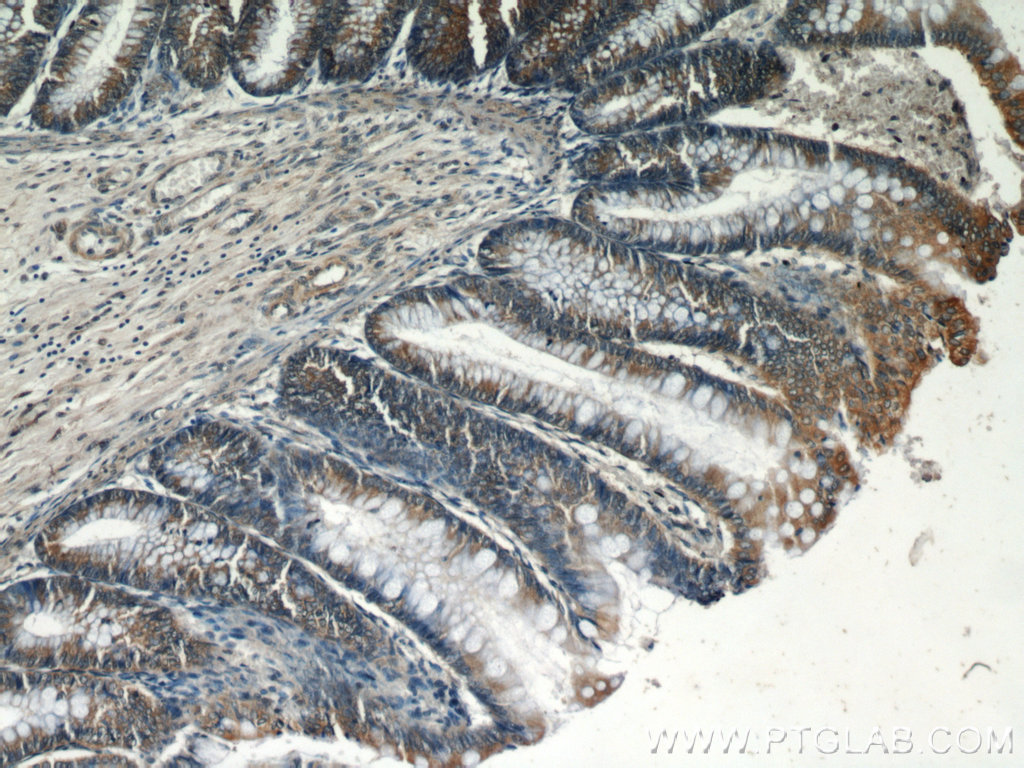 - Immunohistochemical of paraffin-embedded human colon using 55212-1-AP(PLS1 antibody) at dilution of 1:50 (under 10x lens)