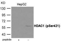 - Western blot analysis of extracts from HepG2 cells using HDAC1 (Phospho-Ser421) Antibody #12037.The lane on the left is treated with the antigen-specific peptide.