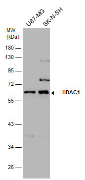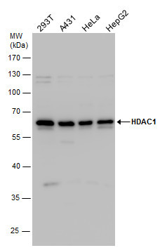 - HDAC1 antibody detects HDAC1 protein by western blot analysis. Various whole cell extracts (30 ?g) were separated by 10% SDS-PAGE, and the membrane was blotted with HDAC1 antibody (GTX100513) diluted by 1:1000. The HRP-conjugated anti-rabbit IgG antibody (GTX213110-01) was used to detect the primary antibody.