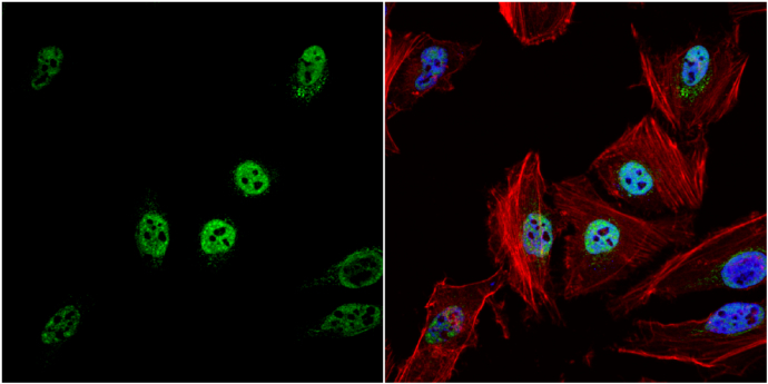- HDAC1 antibody detects HDAC1 protein at nucleus by immunofluorescent analysis.Sample: HeLa cells were fixed in 4% paraformaldehyde at RT for 15 min.Green: HDAC1 protein stained by HDAC1 antibody (GTX100513) diluted at 1:500.Red: phalloidin, a cytoskeleton marker, stained by phalloidin (invitrogen, A12380) diluted at 1:200.Blue: Hoechst 33342 staining.