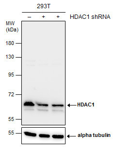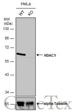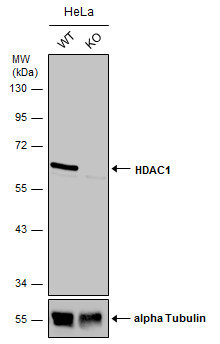 - Wild-type (WT) and HDAC1 knockout (KO) HeLa cell extracts (30 ?g) were separated by 10% SDS-PAGE, and the membrane was blotted with HDAC1 antibody (GTX100513) diluted at 1:500. The HRP-conjugated anti-rabbit IgG antibody (GTX213110-01) was used to detect the primary antibody.