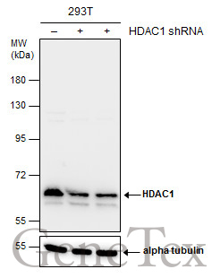 - Various whole cell extracts (30 ?g) were separated by 10% SDS-PAGE, and the membrane was blotted with HDAC1 antibody (GTX100513) diluted at 1:1000. The HRP-conjugated anti-rabbit IgG antibody (GTX213110-01) was used to detect the primary antibody.