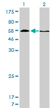 - Western Blot analysis of HDAC1 expression in transfected 293T cell line by HDAC1 monoclonal antibody (M14), clone 5C11.Lane 1: HDAC1 transfected lysate(55.1 KDa).Lane 2: Non-transfected lysate.