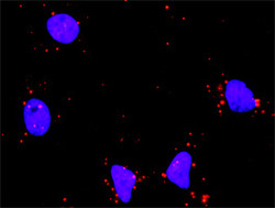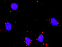 - Proximity Ligation Analysis of protein-protein interactions between NFKB1 and HDAC1. HeLa cells were stained with anti-NFKB1 rabbit purified polyclonal 1:1200 and anti-HDAC1 mouse monoclonal antibody 1:50. Each red dot represents the detection of protein-protein interaction complex, and nuclei were counterstained with DAPI (blue).
