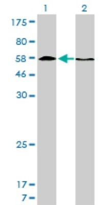 - Western Blot: HDAC1 Antibody (5C11) [H00003065-M14] - Analysis of HDAC1 expression in transfected 293T cell line by HDAC1 monoclonal antibody (M14), clone 5C11. Lane 1: HDAC1 transfected lysatE (55.1 KDa). Lane 2: Non-transfected lysate.