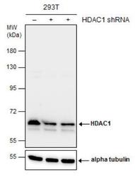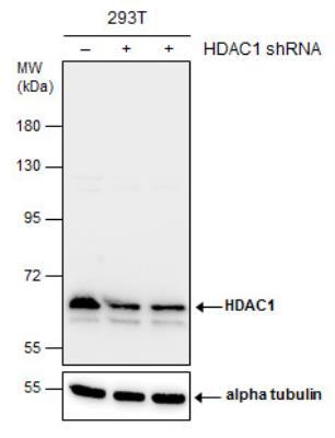 - Western Blot: HDAC1 Antibody [NBP1-31294] - Non-transfected (-) and transfected (+) 293T whole cell extracts (30 ug) were separated by 7.5% SDS-PAGE, and the membrane was blotted with HDAC1 antibody. The HRP-conjugated anti-rabbit IgG antibody was used to detect the primary antibody.