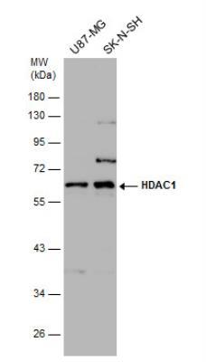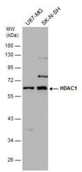 - Western Blot: HDAC1 Antibody [NBP1-31294] - Various whole cell extracts (30 ug) were separated by 10% SDS-PAGE, and the membrane was blotted with HDAC1 antibody diluted at 1:1000. The HRP-conjugated anti-rabbit IgG antibody (NBP2-19301) was used to detect the primary antibody.