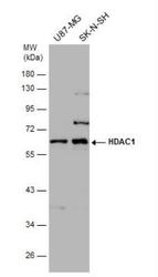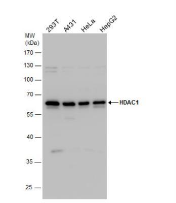 - Western Blot: HDAC1 Antibody [NBP1-31294] - Various whole cell extracts (30 ug) were separated by 10% SDS-PAGE, and the membrane was blotted with HDAC1 antibody diluted at 1:1000. The HRP-conjugated anti-rabbit IgG antibody was used to detect the primary antibody.