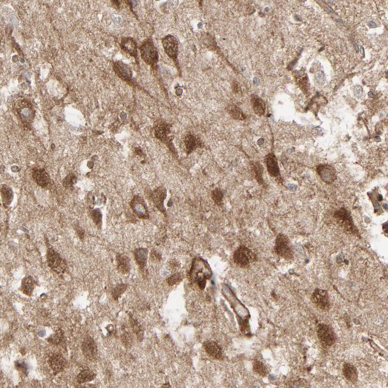 - Immunohistochemical staining of human hippocampus shows strong cytoplasmic positivity in neuronal cells.
