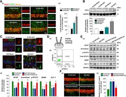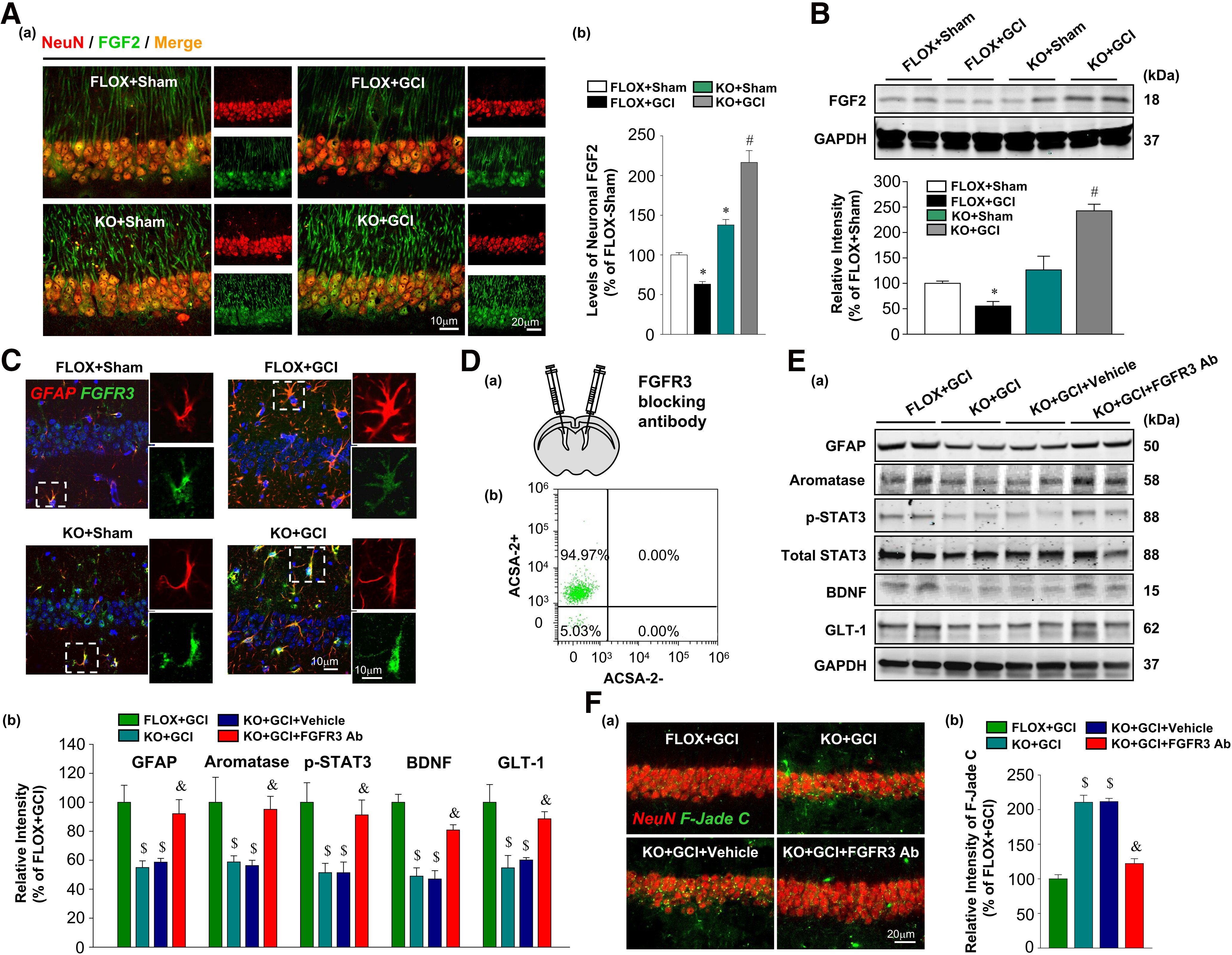 - Figure 9. Evidence that upregulation of neuronal FGF2 signaling mediates decreased astrocyte activation in ovariectomized female FBN-ARO-KO mice after GCI. Aa , Representative image of FGF2 and NeuN double staining in hippocampal CA1 region. Ab , Quantitative analysis of neuronal FGF2 levels in each group ( N = 4 or 5). B , Neuronal FGF2 alterations in hippocampus were confirmed by Western blotting analysis ( N = 3). C , Representative images of FGFR3 and GFAP double staining showing changes of FGFR3 expression in hippocampal CA1 astrocytes ( N = 4 or 5). Da , Schematic illustration of FGFR3 neutralization by bilateral intracerebroventricular injection of FGFR3 blocking antibody in FBN-ARO-KO GCI mice. Db , The purity of isolated astrocytes from the ischemic brains was evaluated by flow cytometry analysis. E , To examine the effects of FGFR3 neutralization on astrocyte reactivity and functional restoration in FBN-ARO-KO mice after GCI, levels of GFAP, p-STAT3, BDNF, and GLT-1 in purified astrocytes were determined by Western blotting ( Ea ), and further quantitatively analyzed ( Eb ) ( N = 3). Fa , IHC analysis for neuronal degeneration by F-Jade C and NeuN double staining in hippocampal CA1 region. Fb , Quantification of F-Jade C levels in CA1 pyramidal neurons, which was presented as relative intensity of each group versus FLOX+GCI ( N = 4 or 5). Values are mean +- SEM of determinations from each group. * p < 0.05 versus FLOX+Sham. # p < 0.05 versus FLOX+GCI. $ p < 0.05 ver