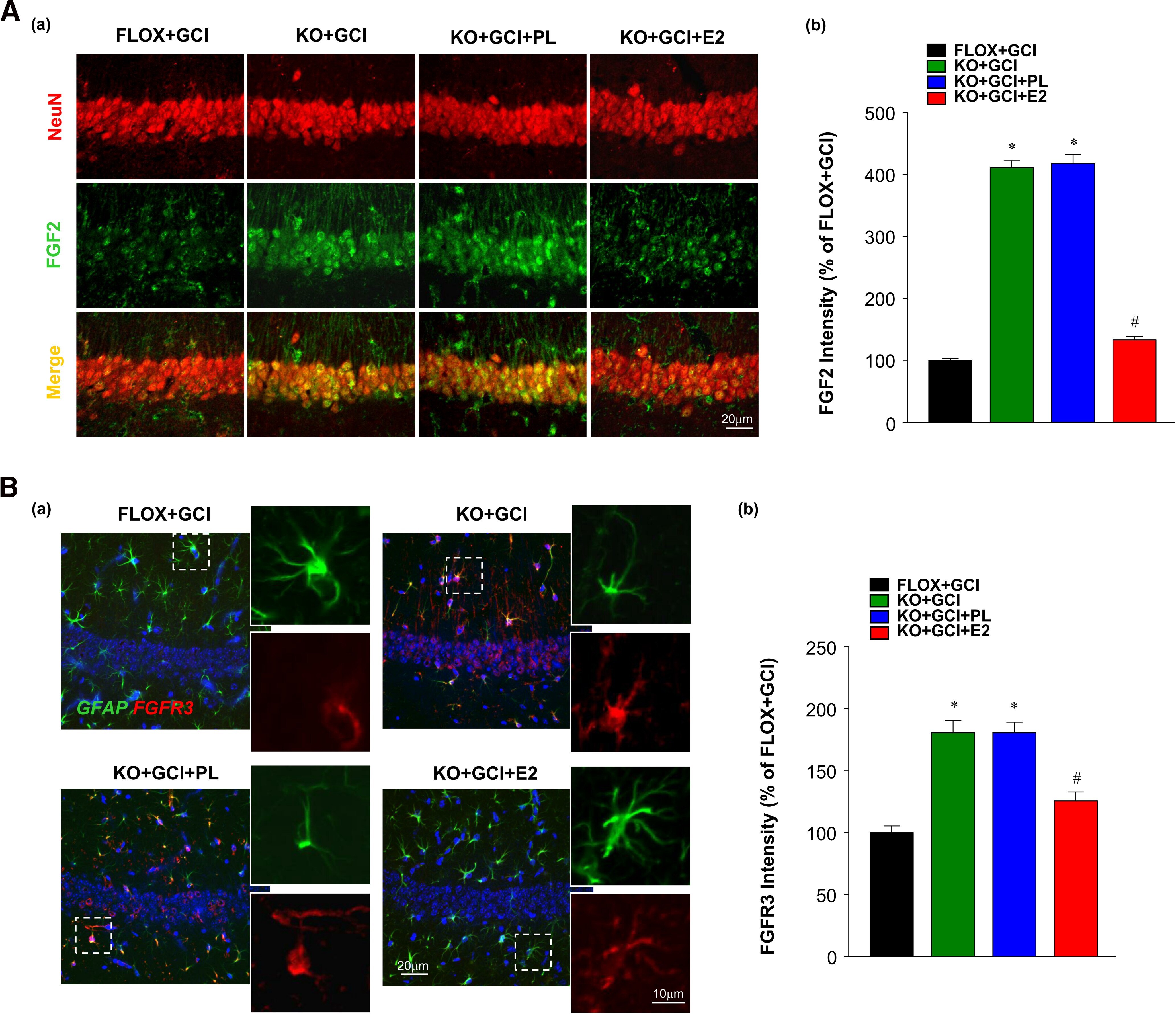 - Figure 10. Exogenous E2 replacement decreases hippocampal FGF2 signaling in ovariectomized female FBN-ARO-KO mice. Aa , Effect of exogenous E2 replacement on neuronal FGF2 expression in FBN-ARO-KO mice was examined by NeuN and FGF2 double staining. Ab , Relative neuronal FGF2 intensities after E2 treatment were quantitatively analyzed. Ba , Levels of the major FGF2 receptor FGFR3 in hippocampal astrocytes were determined by GFAP and FGFR3 staining. Bb , FGFR3 relative intensities in FBN-ARO-KO mice after E2 rescue were quantified. Values are mean +- SEM of determinations from each group. N = 4. * p < 0.05 versus FLOX+GCI. # p < 0.05 versus KO+GCI.