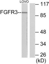 - Western blot analysis of extracts from LOVO cells, using FGFR3 antibody. The lane on the right is treated with the synthesized peptide.