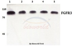 - Western blot (WB) analysis of FGFR3 (W153) pAb at 1:500 dilutionLane1:Hela cell lysateLane2:A549 cell lysateLane3:Mouse kidney tissue lysateLane4:Mouse heart tissue lysateLane5:Rat lung tissue lysate