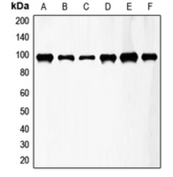 - Western blot analysis of FGFR3 expression in HeLa (A); A549 (B); T47D (C); mouse kidney (D); mouse heart (E); rat lung (F) whole cell lysates.