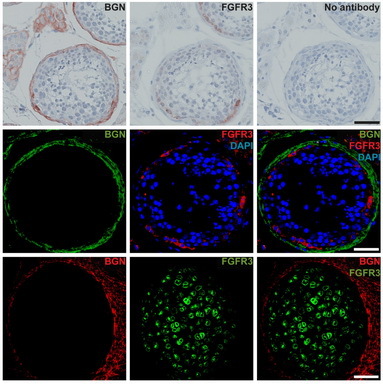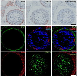 - Figure from citation: Immunohistochemical and Immunofluorescense staining with anti-BGN and anti-FGFR3 of serial sections of adult human testis tissue with full spermatogenesis and fetal bone sample (gestational week 10). Scale bar is 50 um for all images. Dilution: 1:200