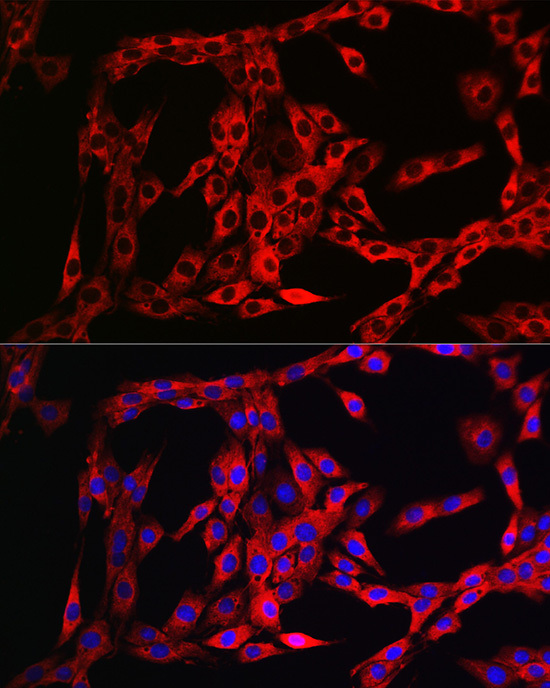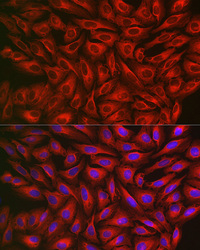- Immunofluorescence analysis of NIH/3T3 cells using FGFR3 rabbit polyclonal antibody (STJ23659) at dilution of 1:100 (40x lens). Blue: DAPI for nuclear staining.