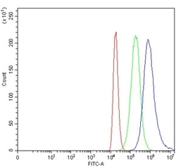 - Flow cytometry testing of human 293T cells with Fibroblast Growth Factor Receptor 3 antibody at 1ug/million cells (blocked with goat sera); Red=cells alone, Green=isotype control, Blue= Fibroblast Growth Factor Receptor 3 antibody.