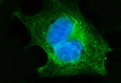 - Immunofluorescent staining of FFPE human Caco-2 cells with Fibroblast Growth Factor Receptor 3 antibody (green) and DAPI nuclear stain (blue). HIER: steam section in pH6 citrate buffer for 20 min.
