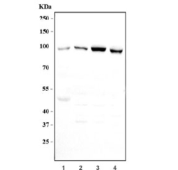 - Western blot testing of human 1) A549, 2) HeLa, 3) HepG2 and 4) HEK293 cell lysate with Fibroblast Growth Factor Receptor 3 antibody. Predicted molecular weight: 87-135 kDa depending on glycosylation level.