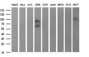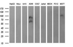 - Western blot of extracts (35ug) from 9 different cell lines by using anti-CD44 monoclonal antibody (HepG2: human; HeLa: human; SVT2: mouse; A549: human; COS7: monkey; Jurkat: human; MDCK: canine; PC12: rat; MCF7: human).