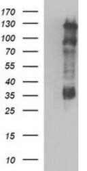 - HEK293T cells were transfected with the pCMV6-ENTRY control (Left lane) or pCMV6-ENTRY CD44 (Right lane) cDNA for 48 hrs and lysed. Equivalent amounts of cell lysates (5 ug per lane) were separated by SDS-PAGE and immunoblotted with anti-CD44.