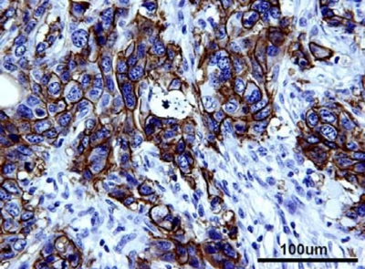 - Immunohistochemical staining of breast invasive ductal carcinoma with with CD44 (v9) monoclonal antibody, clone RV3 (Cat # MAB12149) at 0.2 ug/mL concentration.