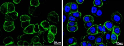 - Immunofluorescence staining of human mammary adenocarcinoma cells with CD44 (v9) monoclonal antibody, clone RV3 (Cat # MAB12149) at 3 ug/mL concentration. (left)Merged image with DAPI staining (right).