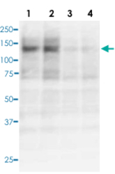 - Western blot analysis of Lane 1: no treated, Lane 2: non-targeting siRNA treated sample, Lane 3: CD44 siRNA treated sample #1, Lane 4: CD44 siRNA treated sample #2 with CD44 (v9) monoclonal antibody, clone RV3 (Cat # MAB12149) at 1 ug/mL concentration.