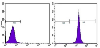 - Flow cytometric analysis of Hela cells using CD44 mouse mAb (right) and negative control (left).