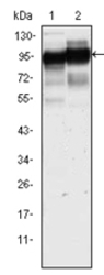 - Western blot analysis using CD44 mouse mAb against Hela (1) and HUVE-12(2) cell lysate.